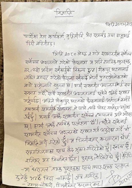 ‘मिति २०८० जेष्ठ २ गते सम्मानित सर्वोच्च अदालतले गरेको फैसलामा म प्रति न्यायिक नहुन सक्छ तर त्यसो भन्दैमा स्वीकार्नुको विकल्प हुन्न। टीकापुर घटनालाई लक्षित बनाएर गरेको फैसला स्वीकार्दै भोलि पुनरावलोकनको बाटो हाम्रो लागि खुला छ,’ उनले विज्ञप्तिमा लेखेका छन् ।