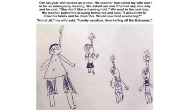 पोस्टमा ती व्यक्तिले थप लेखेका छन्– यसमा मेरी श्रीमतीले भनिन् यसमा व्याख्या गर्ने के छ । यो हाम्रो पारिवारिक छुट्टीको रेखाचित्र हो जब हामी बहामासमा स्नोर्कलिंग गयौं। तब मात्र शिक्षकले चित्रलाई राम्ररी बुझे।