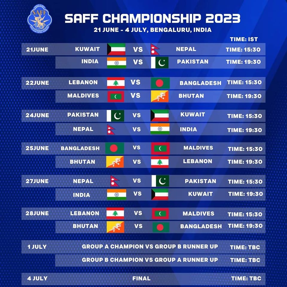 असार ६ गते हुने नेपाल र कुवेतबीचको उद्घाटन खेल नेपाली समय अनुसार पौने ४ बजे सुरु हुनेछ । सोहि दिन हुने अर्को खेलमा भारतले पाकिस्तानको सामना गर्ने भएको छ ।