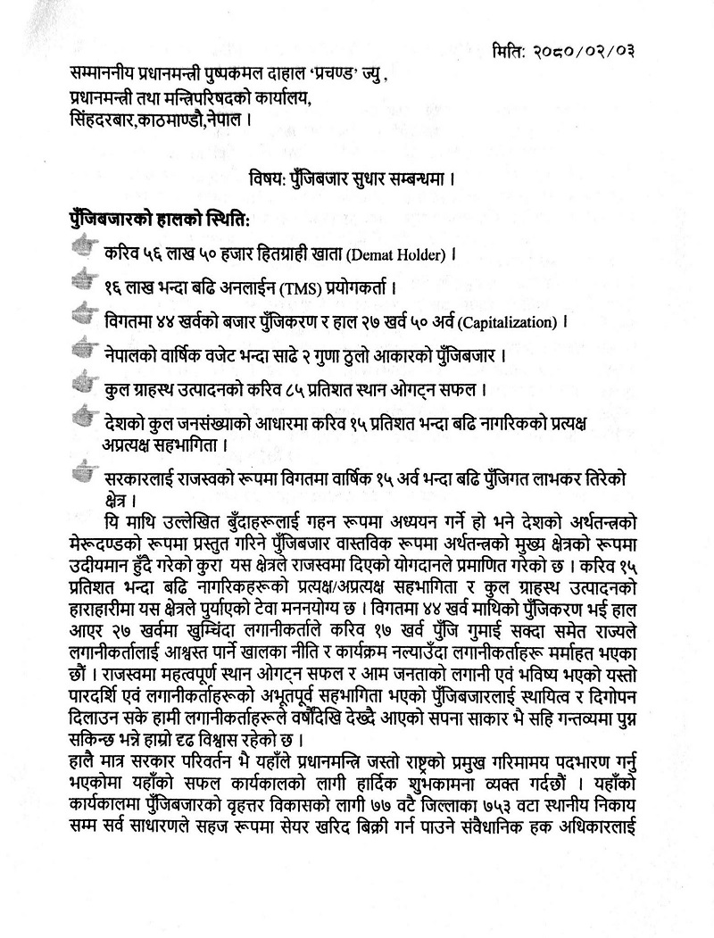 काठमाडौँ। सेयर बजारका लगानीकर्ताहरुले प्रधानमन्त्री पुष्प कमल दाहाल (प्रचण्ड) लाई भेटेर ६ बुँदे मागसहित ज्ञापनपत्र बुझाएका छन्। लगानीकर्ताहरुले प्रधानमन्त्री दाहालसँग भेट गरी पुँजी बजार सुधारका लागि विभिन्न मागहरु प्रस्तुत गरेका हुन्।
