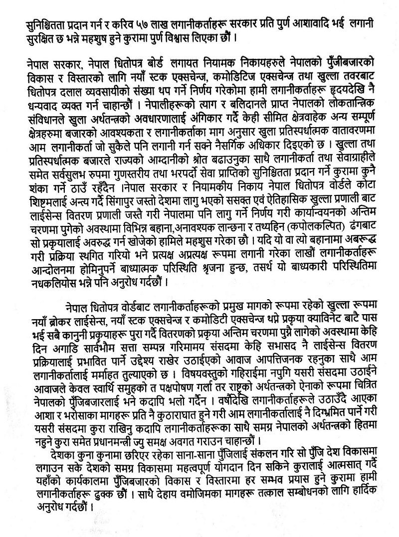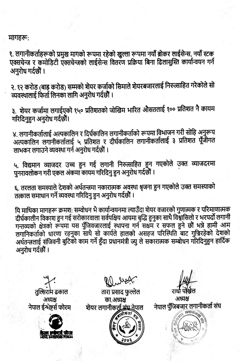 उनीहरुले प्रमुख मागका रुपमा रहेका खुला रुपमा नयाँ ब्रोकर लाइसेन्स, नयाँ स्टक एक्सचेन्ज र कमोडिटी एक्सचेन्जको लाइसेन्स वितरण प्रक्रिया बिना ढिलासुस्ती कार्यान्वयन गर्न माग गरिएको छ।। बुधबार नेपाल इन्भेष्टर्स फोरम, सेयर लगानीकर्ता संघ नेपाल र नेपाल पुँजी बजार लगानीकर्ता संघका प्रतिनिधिहरुको टोलीले प्रधानमन्त्रीलाई भेटेका हुन्।