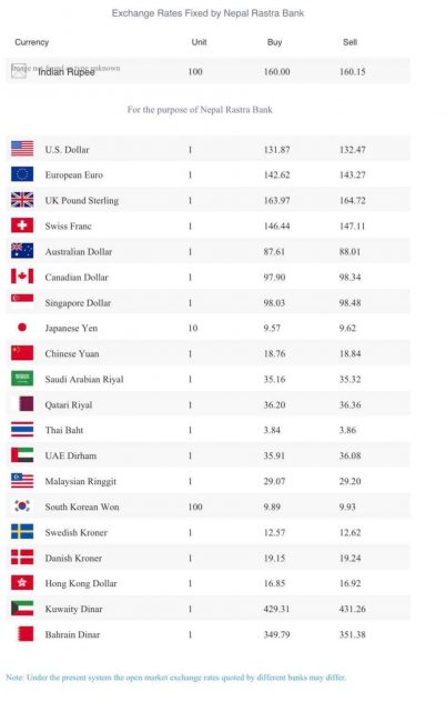 आज डलरको खरिद दर १३१ रूपैयाँ ८७ पैसा र बिक्री दर १३२ रूपैयाँ ४७ पैसा रहेको छ। युरो एकको खरिद दर १४२ रूपैयाँ ६२ पैसा र बिक्री दर १४३ रूपैयाँ २७ पैसा रहेको छ।