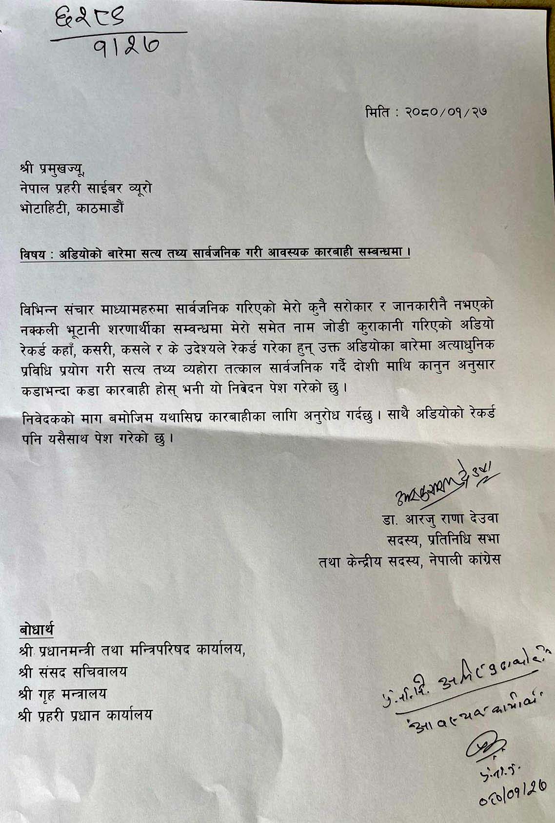 ‘विभिन्न सञ्चारमाध्यममा सार्वजनिक गरिएको मेरो कुनै सरोकार र जानकारी नै नभएको नक्कली भुटानी शरणार्थीका सम्बन्धमा मेरोसमेत नाम जोडी कुराकानी गरिएको अडियो रेकर्ड कहाँ, कसरी, कसले र के उद्देश्यले रेकर्ड गरेका हुन्? उक्त अडियोबारे अत्याधुनिक प्रविधि प्रयोग गरी सत्यतथ्य व्यहोरा तत्काल सार्वजनिक गर्दै दोषीमाथि कानुनअनुसार कडाभन्दा कडा कारबाही होस्,’ उजुरीमा भनिएको थियो।