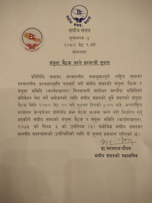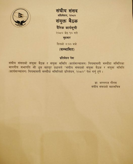 ‘संघीय संसदको संयुक्त बैठक र संयुक्त समिति (कार्य सञ्चालन) नियमावली मस्यौदा समितिका माननीय सभापति ध्रुबबहादुर प्रधानले ‘संघीय संसदको संयुक्त बैठक र संयुक्त समिति (कार्य सञ्चालन नियमावली मस्यौदा समितिको प्रतिबेदन, २०८०’ पेश गर्नु हुने’ सम्भावित कार्यसूचीमा उल्लेख छ।