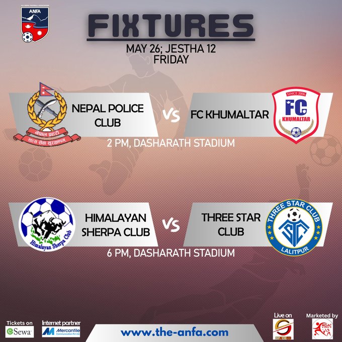 जसअनुसार पहिलो खेल नेपाल पुलिस क्लब र खुमलटारका बीचमा हुनेछ। जुन खेल दिउँसो २ बजेवाट सुरु हुनेछ। उता, रंगशालामा नै हुने दोस्रो खेलमा हिमालयन शेर्पा र थ्रि स्टार बीच प्रतिस्पर्धा हुनेछ। सो खेल साँझ ६ बजेबाट सुरु हुनेछ।