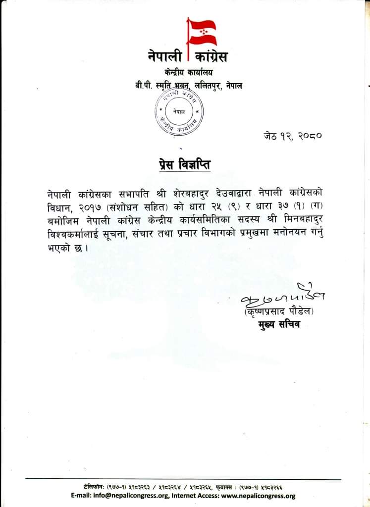 कांग्रेस पार्टी कार्यालयका मुख्यसचिव कृष्णप्रसाद पौडेलका अनुसार सभापति देउवाले कांग्रेसको विधान २०१७ (संशोधनसहित) को धारा २५ (९) र धारा ३७ (१) (ग)अनुसार विश्वकर्मालाई प्रचार विभाग प्रमुखमा मनोनयन गरिएको हो ।