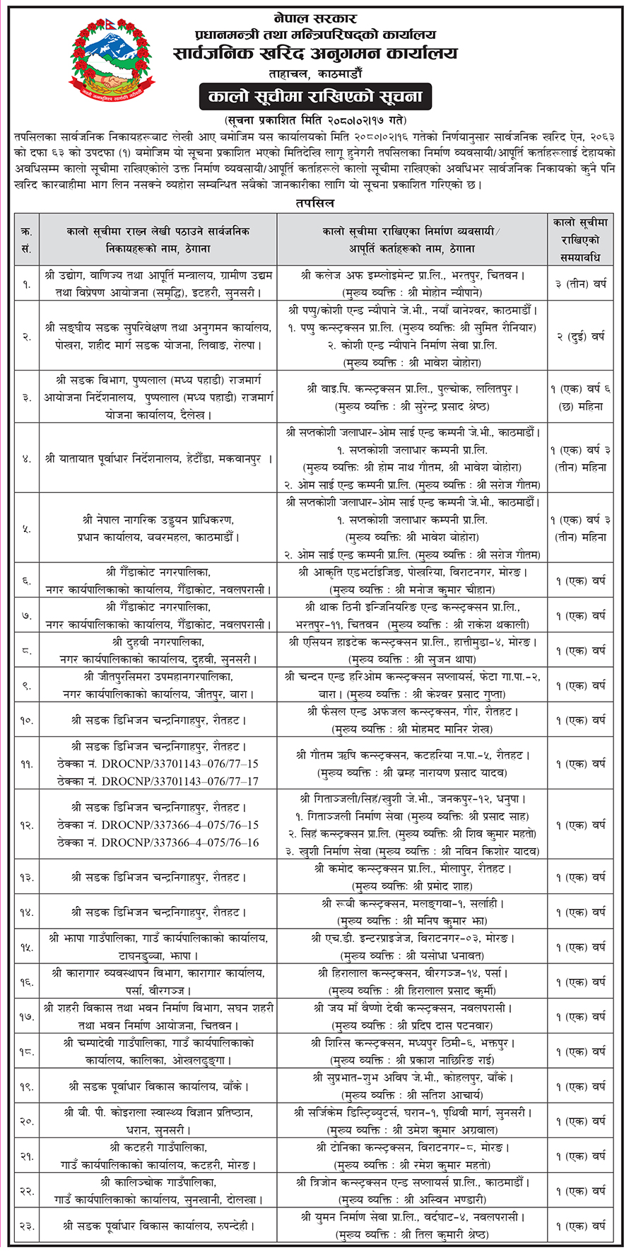 कलेज अफ इम्प्लोइमेन्ट प्रालि भरतपुर चितवन लाई तीन वर्ष, पप्पु कन्स्ट्रक्सन, कोशी एण्ड न्यौपाने निर्माण सेवालाई २ वर्ष, वाईपी कन्स्ट्रक्सनलाई साढे एक र बाँकी सबैलाई एक वर्षका लागि कालो सूचीमा राखिएको छ।