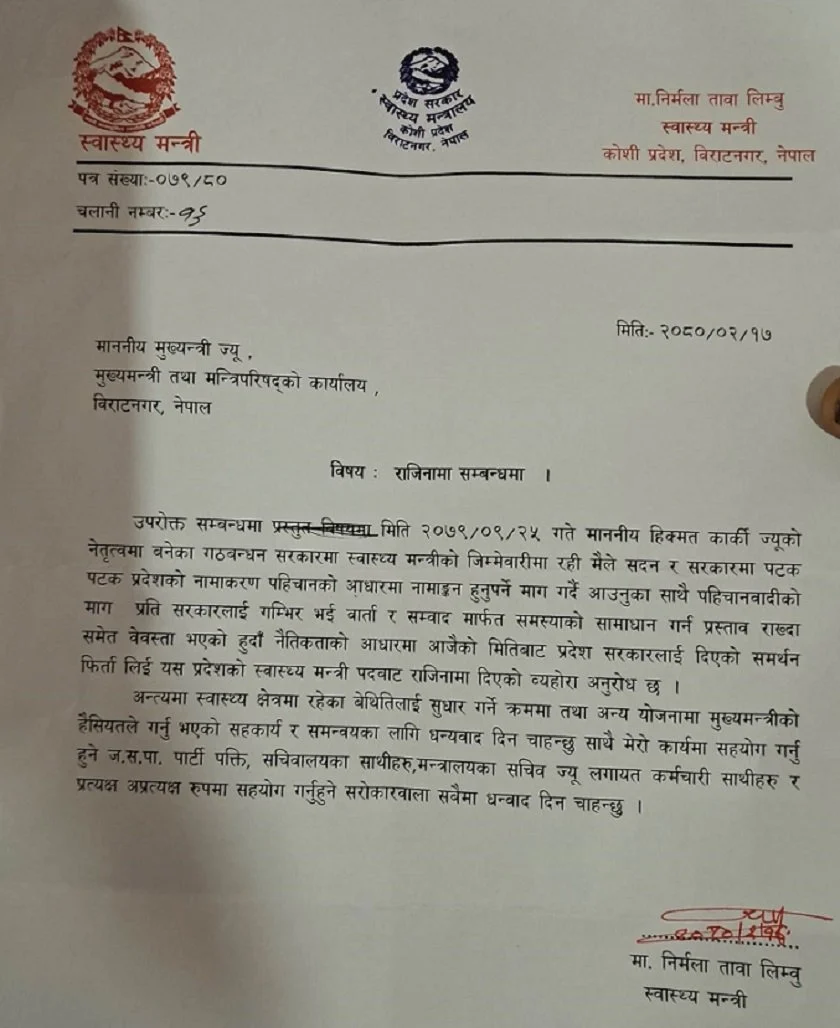 विराटनगर । जसपाबाट कोशी प्रदेशको स्वास्थ्य मन्त्री बनेकी निर्मला तावा लिम्बूले राजीनामा दिएकी छन् ।