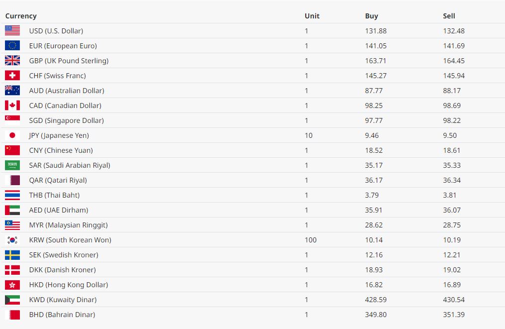 आज अमेरिकन डलरको खरिद दर १३१ रूपैयाँ ८८ पैसा र बिक्री दर १३२ रूपैयाँ ४८ पैसा रहेको छ भने युरो एकको खरिद दर १४१ रूपैयाँ ०५ पैसा र बिक्री दर १४१ रूपैयाँ ६९ पैसा रहेको छ।