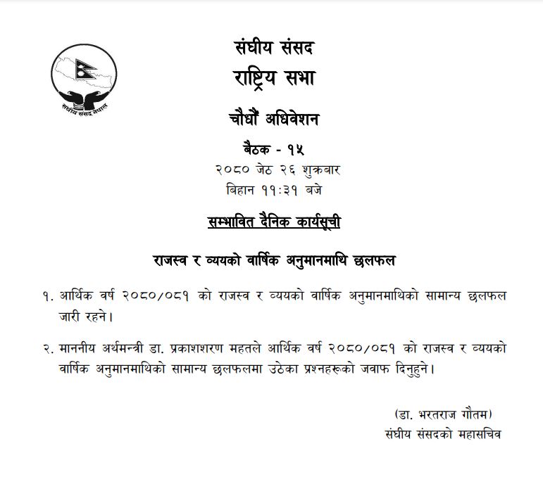 आज बस्ने बैठकमा आर्थिक बर्ष २०८०८१ को राजस्व र व्ययको वार्षिक अनुमान (बजेट) माथिको छलफल जारी रहने र त्यसमाथी उठेका जवाफ अर्थमन्त्री प्रकाशशरण महतले दिने कार्यसुची रहेको छ।