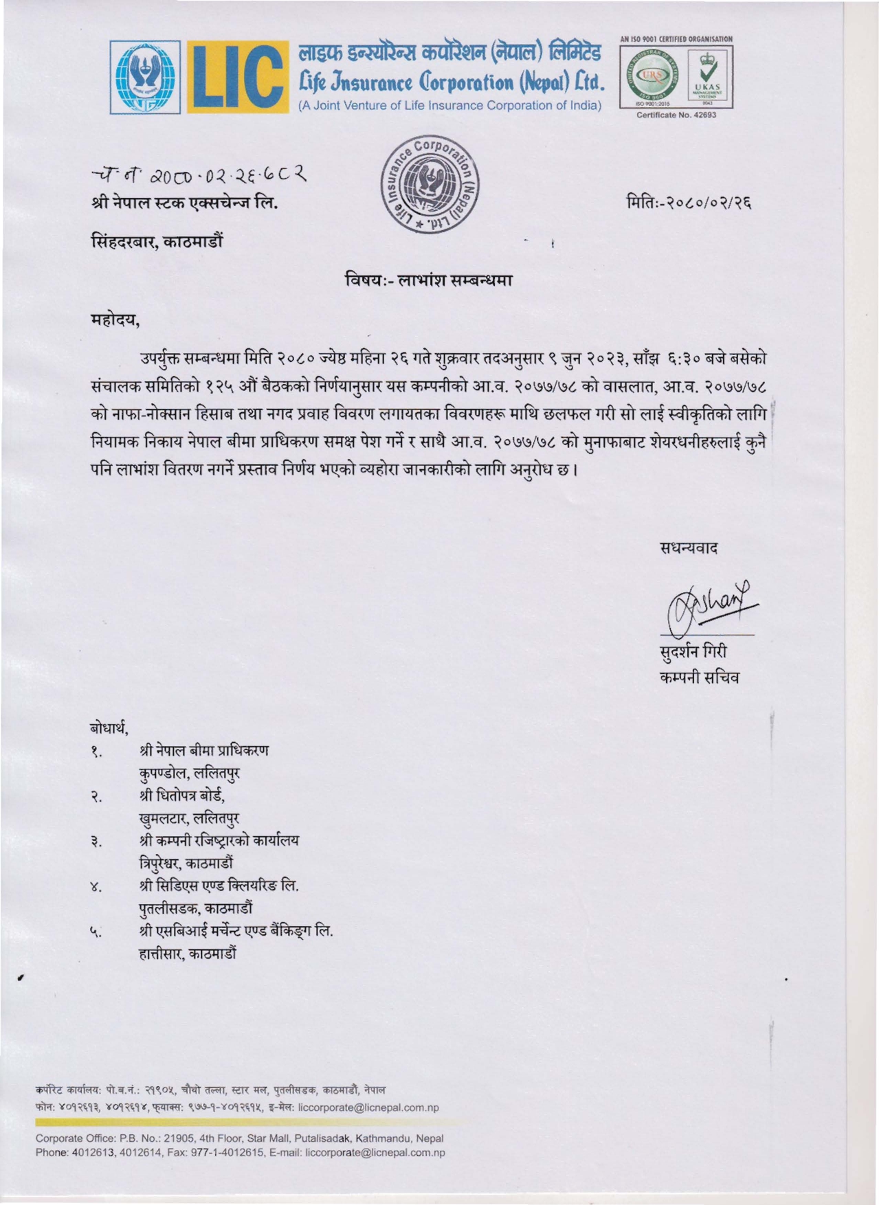 लाइफ इन्स्योरेन्स कर्पोरेसन (नेपाल)ले लाभांश वितरण नगर्ने