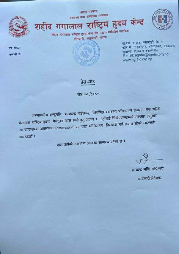 निर्देशक डा. अधिकारीका अनुसार उनका चिकित्सकको सल्लाह अनुसार राष्ट्रपति  पौडेललाई २४ घण्टा अस्पतालमा अवलोकनमा राखिएको छ ।  बुधबार डिस्चार्ज गर्ने तयारी भएको अधिकारीले जानकारी दिए ।
