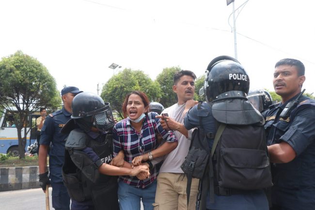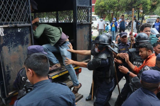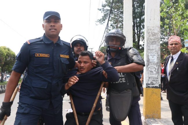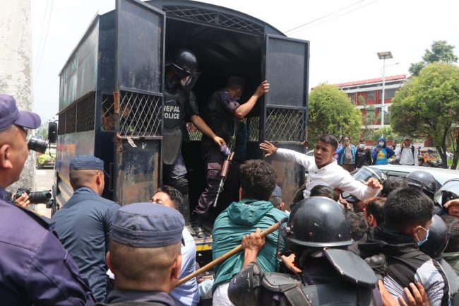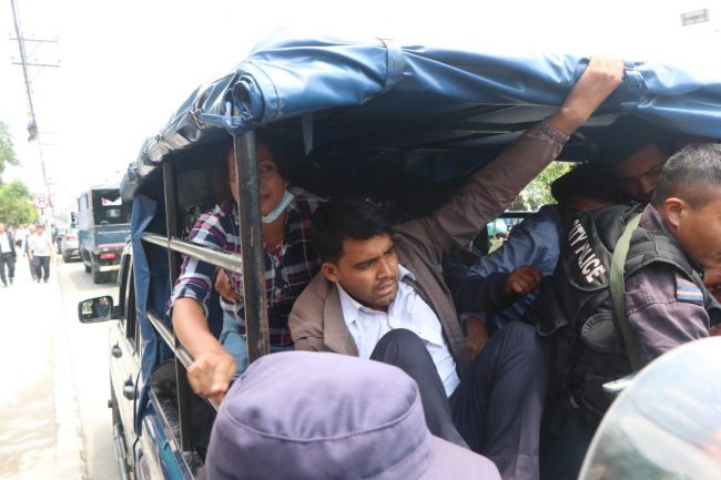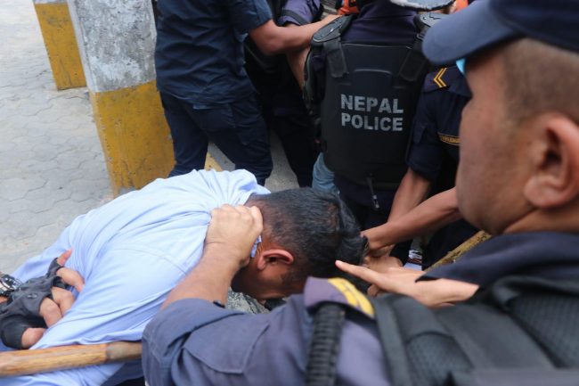 काठमाडौँ। काठमाडौं जिल्ला अदालत बाहिर प्रदर्शनमा उत्रिएका नेत्रविक्रम चन्द विप्लव नेतृत्वको नेकपाका कार्यकर्ता पक्राउ परेका छन्। नक्कली भुटानी शरणार्थी प्रकरणमा पक्राउ परेकालाई कारबाही गर्न माग गर्दै प्रदर्शनमा उत्रिएका उनीहरुलाई प्रहरीले पक्राउ गरेको हो।