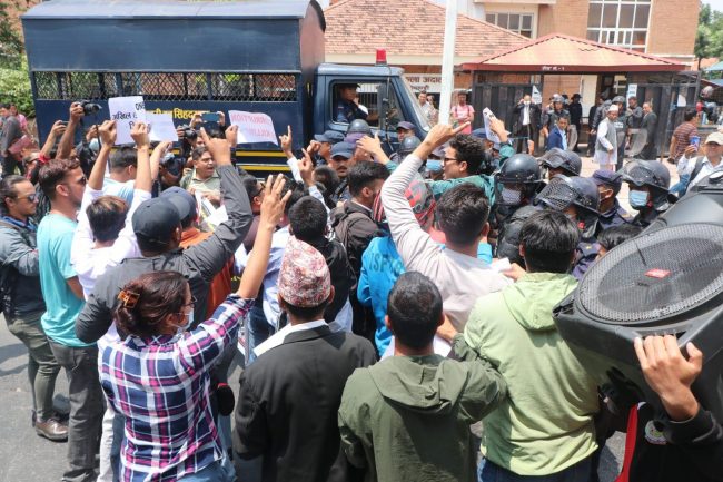 उनीहरुले शरणार्थी प्रकरणमा पक्राउ परेकामाथि कारबाही गर्नुपर्ने भन्दै प्रदर्शन गरेका हुन्। प्रदर्शनमा उत्रिएपछि प्रहरीले रोक्न खोज्दा दुवै पक्षबीच धकेलाधकेल भएको थियो।