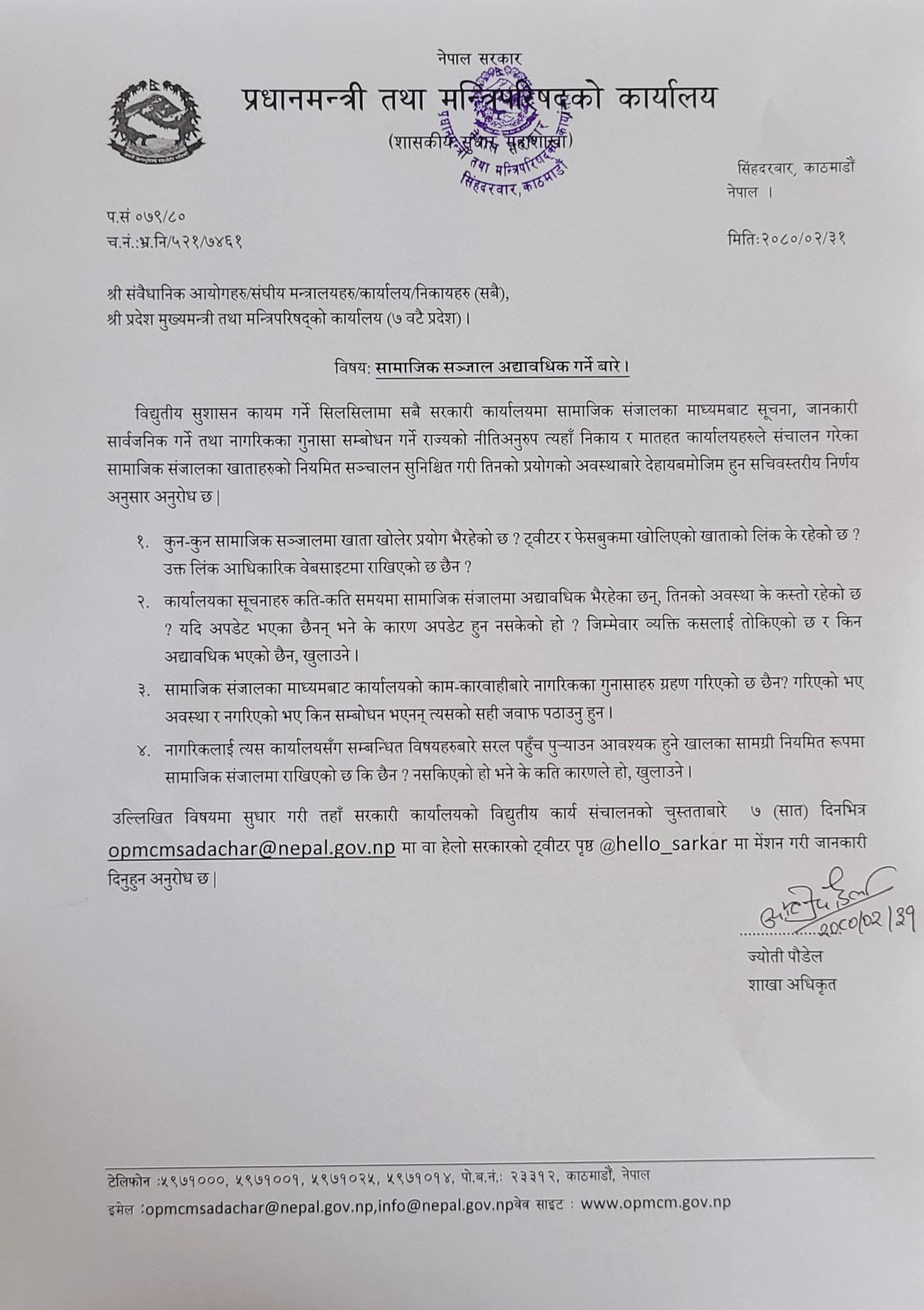 काठमाडौं । प्रधानमन्त्री तथा मन्त्रिपरिषद्को कार्यालयले विद्युतीय सुशासन कायमका लागि सबै सरकारी कार्यालयको सामाजिक सञ्जालको खाता नियमित सञ्चालनको सुनिश्चित गर्न निर्देशन दिएको छ।