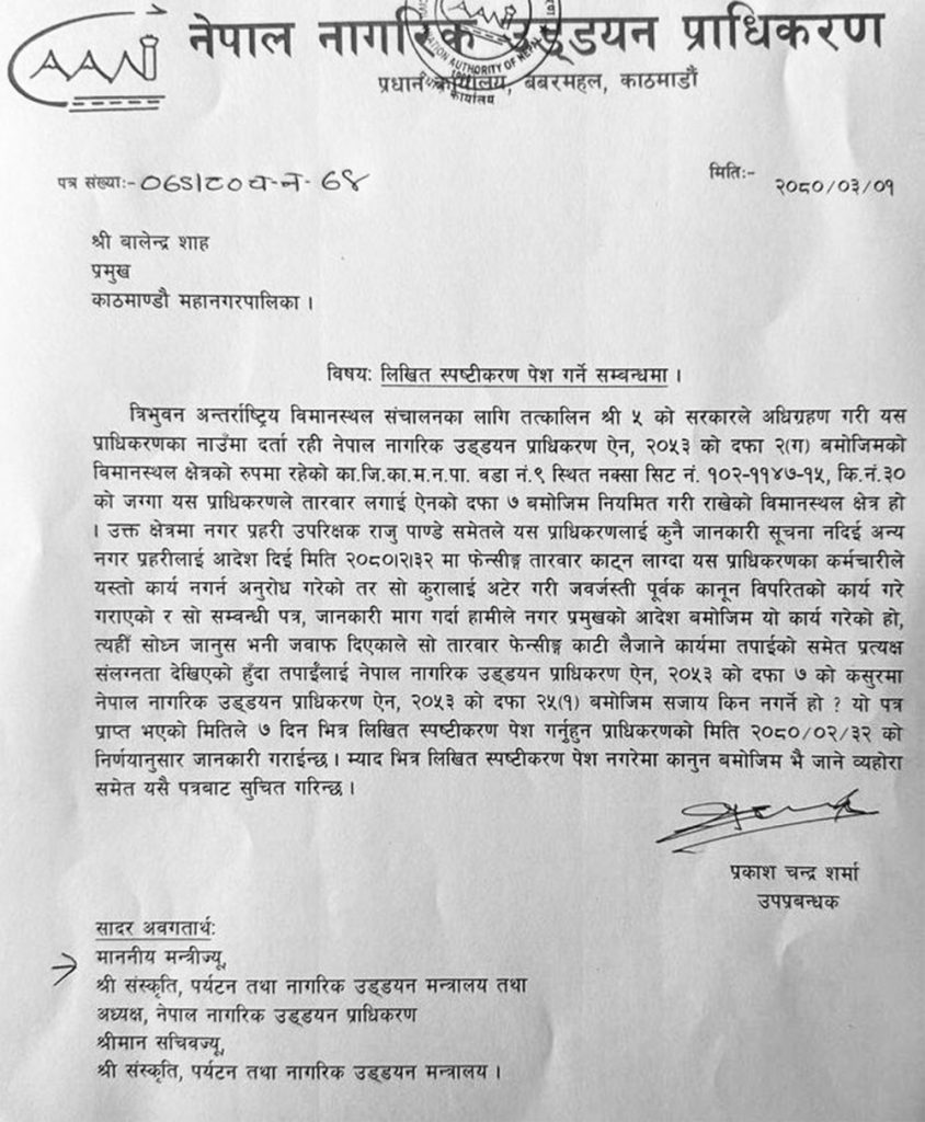 उड्डयन प्राधिकरणले सोध्यो महानगर प्रमुख बालेनलाई स्पष्टीकरण (पत्रसहित)