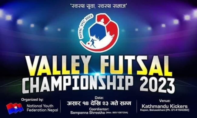 काठमाडौं।काठमाडौं। भ्याली फुटसल च्याम्पियनसिप २०२३ फुटबल प्रतियोगिता असार १४ देखि २३ गतेसम्म आयोजना हुने भएको छ। राष्ट्रिय युवा संघ नेपालले असार ११गते सोमबार पत्रकार सम्मेलन गर्दै प्रतियोगितामा उपत्यका का २२४ वडा बाट खेलमा सहभागी हुने जनाएको छ।