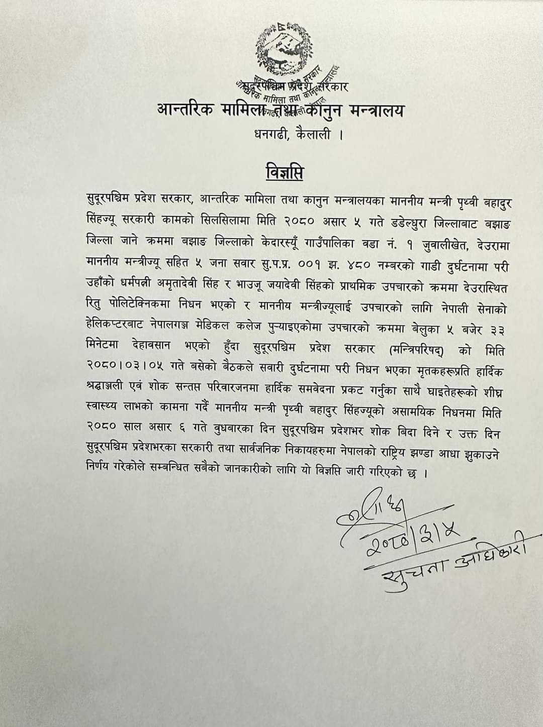 मंगलबार धनगढीबाट बझाङ जाँदै गरेका मन्त्री प्रदेश ०१००१ झ ४८० नम्बरको गाडी दुर्घटनामा परेको थियो। दुर्घटनामा उनकी श्रीमती अमृतादेवी र भाउजु जानकीको घटना स्थलमा मृत्यु भएकोमा सिंहको उपचारको क्रममा मृत्यु भएका मन्त्री सिंहको शोकमा सार्वजनिक बिदा दिने निर्णय गरिएको हो ।