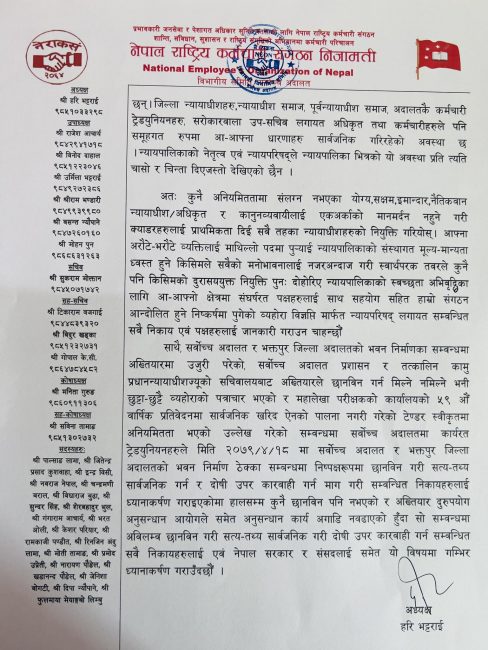 संगठनले सर्वोच्च अदालतमा रिक्त ३ जना न्यायाधीशको लागि सिफारिस भएर पनि क्रमभंग गरी वेवास्तापूर्वक आ–आफ्ना स्वार्थकेन्द्रका सिफारिसमा नियुक्ति गर्ने अभ्यास भइरहेको भन्दै संगठनका अध्यक्ष हरि भट्टराईले जारी गरेको विज्ञप्तिमा भनिएको छ-कुनै पनि तहको अदालतमा न्यायाधीशको नियुक्ति सो सेवामा कार्यरत अन्य न्यायाधीश, कर्मचारीहरु सवैको सरोकारको विषय भएको र अधिकारवालाको स्वविवेकको विषय नभएको हुँदा, पूर्ववत रुपमा सिफारिस भई टुंगोमा नपु¥याईएको सर्वोच्च अदालतको न्यायाधीशको नियुक्ति बारे कुनै टिप्पणी भएको सुनिदैन।न्यायपरिषद्को हालैको वैठकमा पनि उच्च अदालतका न्यायाधीशहरुको मात्र नियुक्तिको चर्चा छ। त्यसमा पनि प्रमाणपत्र लिएका आधारमा कनिष्ट भन्दा कनिष्ट कानुनव्यवसायीलाई जागिर खुवाउन मात्र ल्याउने अभ्यासले बल पाइरहेको वुझिएको छ। विगतमा भएका यस्ता गलत अभ्यासले न्यायापलिका नै धर्मराएको अवस्था छ, न्यायकर्मीहरु मर्माहत भएका छन्।’
