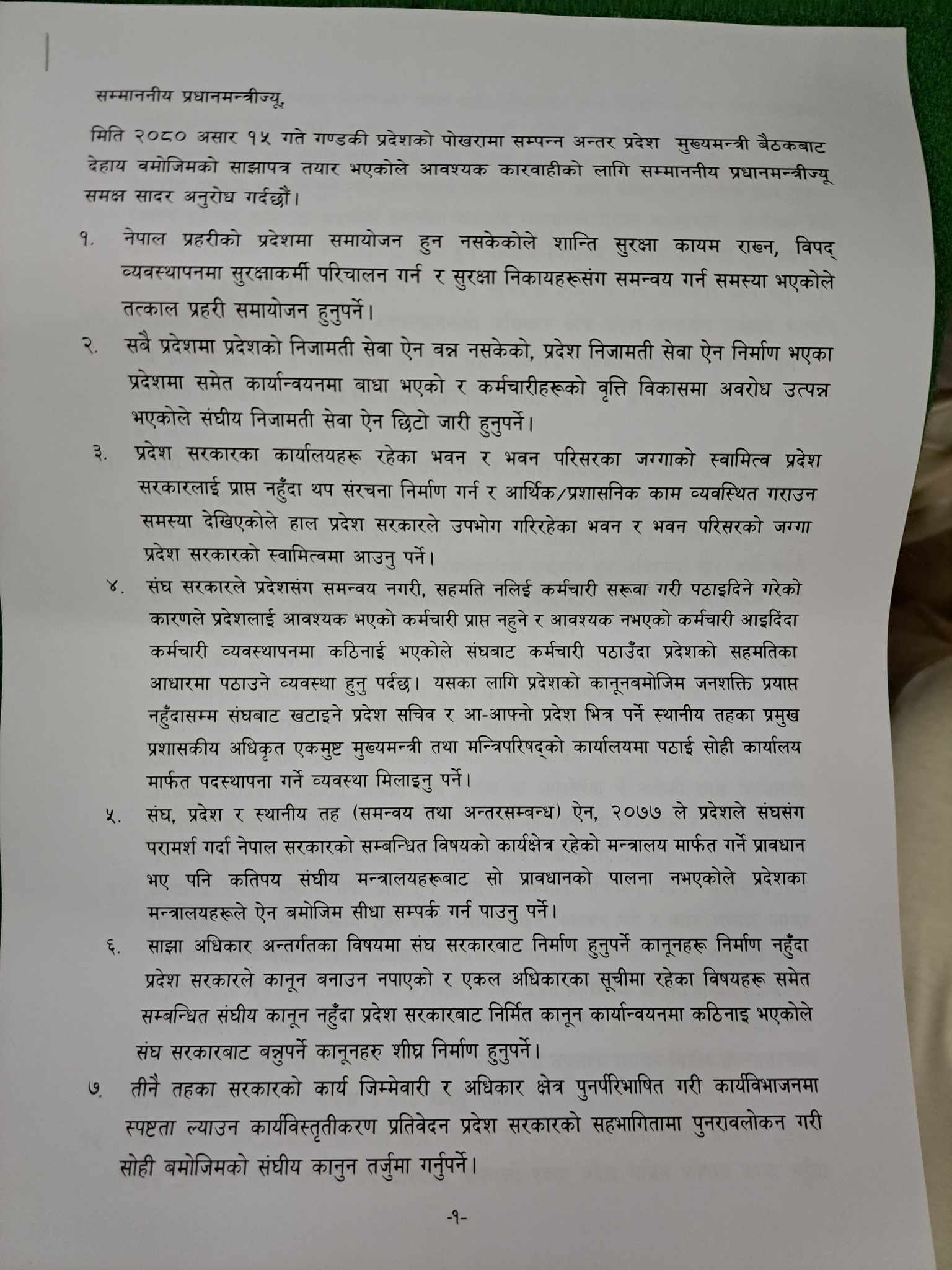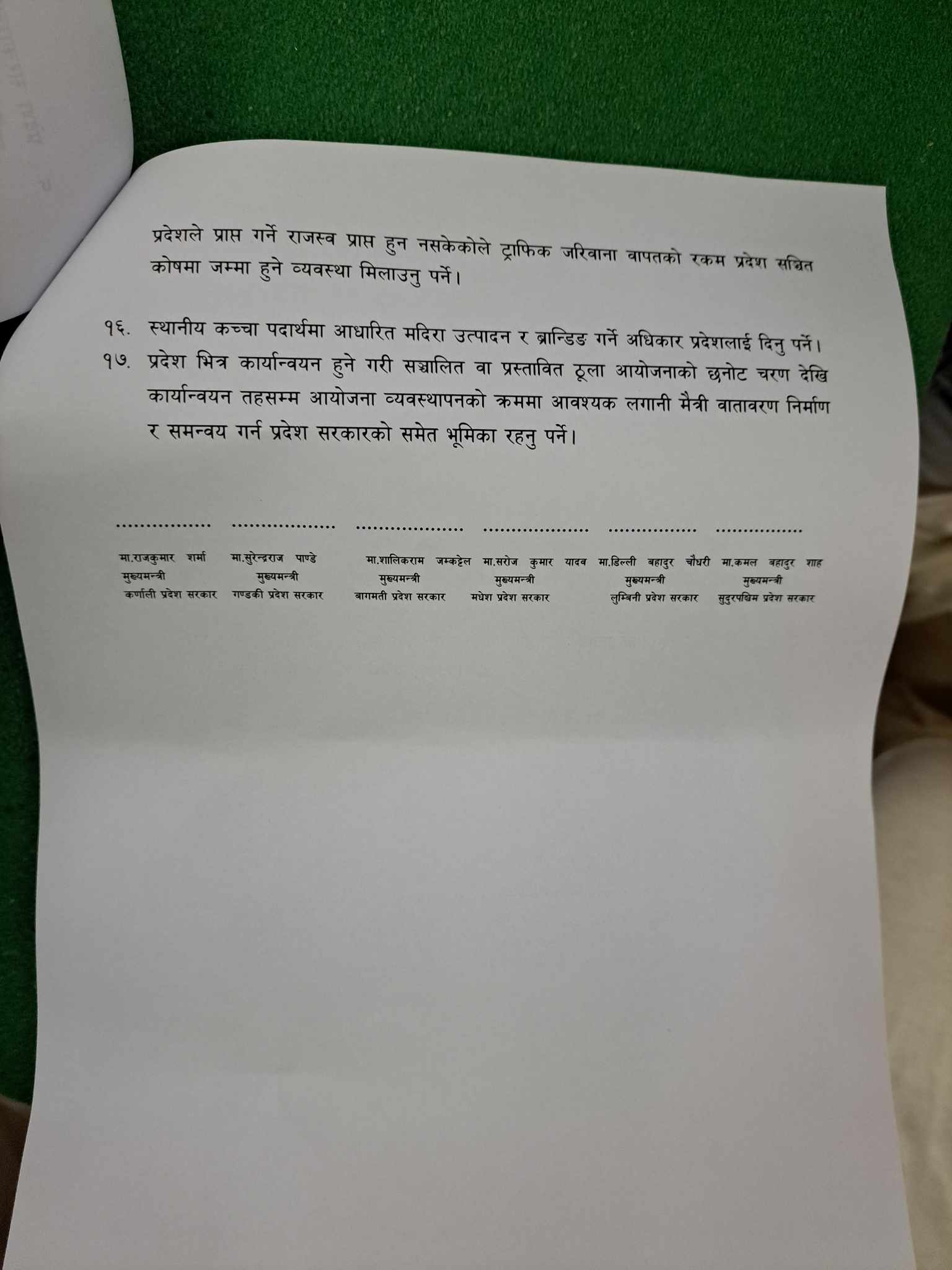 प्रधानमन्त्रीलाई मुख्यमन्त्रीहरूले बुझाए १७ बुँदे साझापत्र (पत्रसहित)