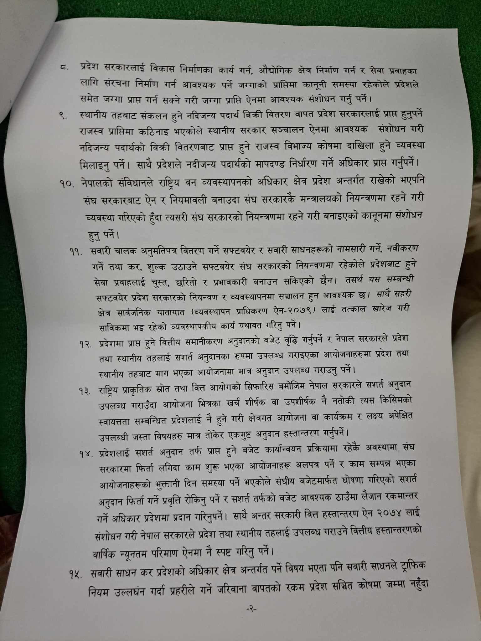 तत्काल प्रहरी समायोजन हुनुपर्ने, संघीय निजामती ऐन लगायतका कानुन ल्याउनुपर्ने, प्रदेश सरकारको कार्यालयहरु रहेका भवन र भवन परिसरको जग्गाको स्वामित्व प्रदेश सरकारको स्वामित्वमा आउनुपर्ने लगायतका माग साझा पत्रमा उल्लेख छ।