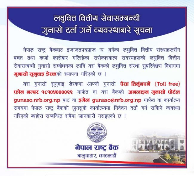लघुवित्त वित्तीय सेवासम्बन्धी गुनासो सुनुवाइका लागि राष्ट्र बैंकले स्थापना गर्यो डेस्क