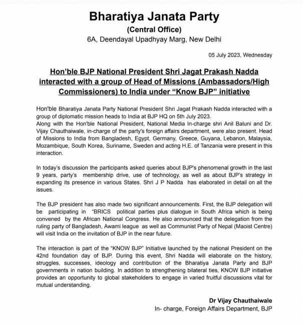 विभिन्न देशका राजनीतिक दलका नेताहरूलाई भाजपाले भारतमा बोलाएर पार्टीको गतिविधि बारे जानकारी गराउने गरेको छ। नड्डाले भनेका छन्, विभिन्न देशका राजनीतिक पार्टीहरूसँग आफ्नो सम्बन्ध बढाउने उद्देश्यका साथ हामीले विभिन्न देशका राजनीतिक दलहरूको प्रतिनिधिहरूलाई यहाँ भारतमा बोलाउने गरेका छौं र हाम्रा पार्टीका प्रतिनिधिहरू विभिन्न देशहरूमा जाने गरेका छन्।