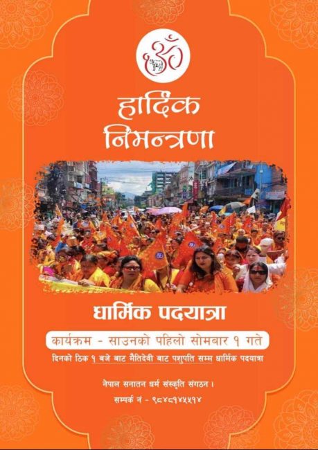 ‘हामी अपरान्ह १२:३० बजे मैतीदेवी मन्दिरमा भेला भइ विभिन्न धार्मिक गतिविधि गर्दै पशुपतिनाथ मन्दिरसम्म पदयात्रा गर्छौं, यो शान्ति पदयात्रा हुनेछ, पुरुषले भने।