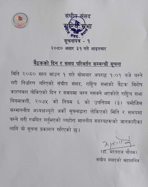 सोमबार दिउँसो १ बजेर १ मिनेटमा बस्नेगरी बोलाइएको राष्ट्रिय सभा बैठक विशेष कारणवस बस्ने नसक्ने भन्दै अनिश्चितकालका लागि स्थगित गरिएको हो ।