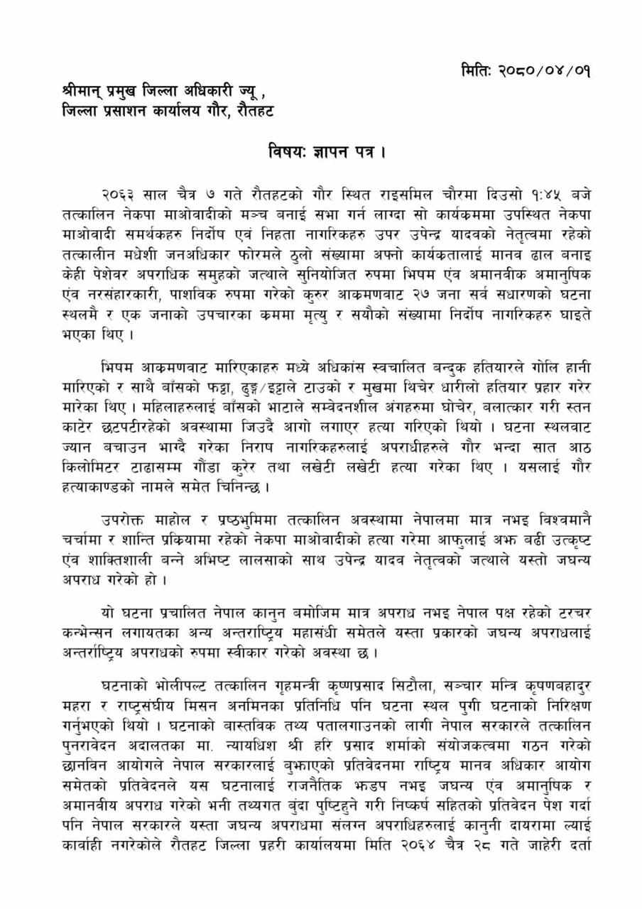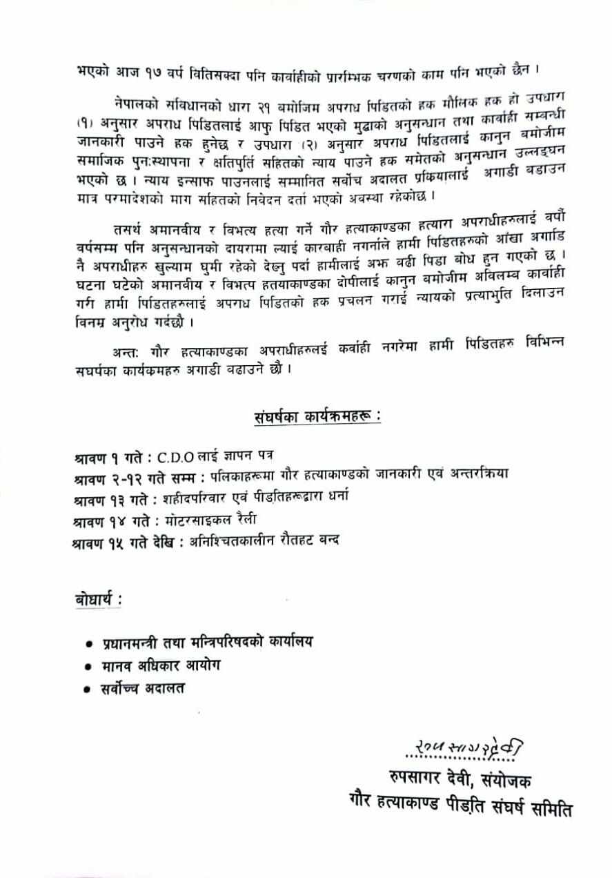 सोमबार समितिले प्रदर्शनसमेत गरेको छ । ‘अमानवीय र विभत्य हत्या गर्ने गौर हत्याकाण्डका हत्यारा अपराधीहरुलाई वर्षों वर्षसम्म पनि अनुसन्धानको दायरामा ल्याई कारवाही नगर्नाले हामी पीडितहरुको आँखा अगाडि नै अपराधिहरु खुलेआम घुमी रहेको देख्नु पर्दा हामीलाई अझ बढी पीडा बोध हुन गएको छ । घटना घटेको अमानवीय र विभत्स हत्याकाण्डका दोषीलाई कानुन बमोजीम अविलम्ब कारबाही गरी हामी पीडितहरुलाई अपराध पीडितको हक प्रचलन गराई न्यायको प्रत्याभूति दिलाउन विनम्र अनुरोध गर्दछौं,’ समिति संयोजक रुपसागर देवीले हस्ताक्षर गरेर प्रमुख जिल्ला अधिकारीलाई बुझाएको ज्ञापनपत्रमा उल्लेख छ ।