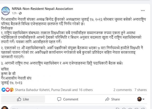 ‘राष्ट्रिय महाधिवेशन सम्बन्धमा तत्काल विश्वभरीका सबै एनसीसीहरू सम्मानजनक रुपमा एकता हुने अवस्था नदेखिएकाले एनसीसीहरूले आफ्नो देशको परिस्थिति र विधान अनुसार सदस्यता खुला गर्दै राष्ट्रिय महाधिवेशनको तयारी गर्ने। यसका लागि आरसीसीहरुले पहल गर्ने,’ बैठकको निर्णय छ।