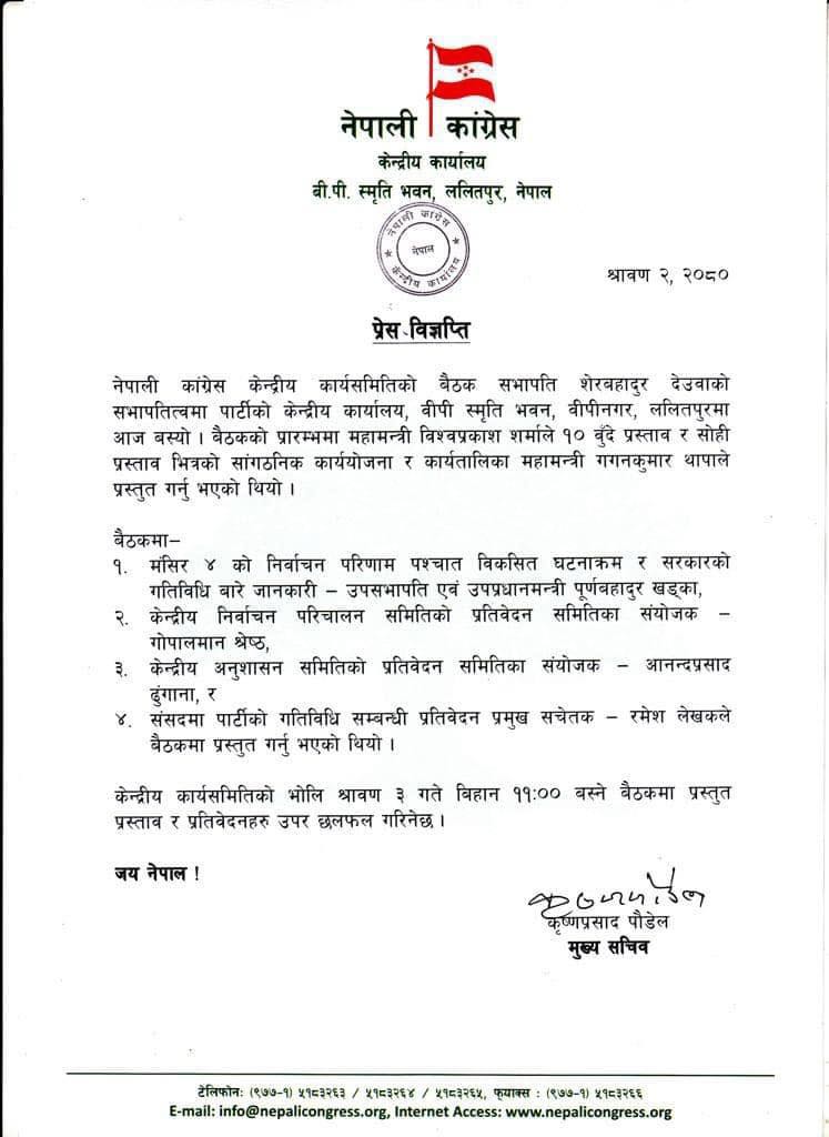 पार्टी केन्द्रीय कार्यालय सानेपामा बसेको पार्टीको केन्द्रीय कार्य समितिको पहिलो दिनको बैठक नेताहरूले विभिन्न प्रस्तुति राख्दै सकिएको हो । दिउँसो २ बजे सुरु भएको बैठक पार्टी सभापति शेरबहादुर देउवाले बैठक प्रारम्भ भएको घोषणा गरेसँगै महामन्त्री विश्वप्रकाश शर्माले बैठकको एजेण्डा राखेका थिए।
