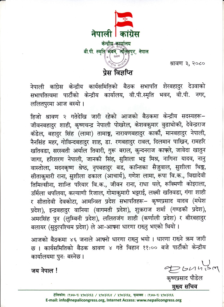 बुधबार पार्टी कार्यालय सानेपामा बसेको केन्द्रीय कार्यसमितिको बैठकको दोश्रो दिन उनीहरुले पार्टीको विधानलाई सहि तवरले कार्यान्वयन गर्दै संरचनालाई चुस्त बनाउन नेतृत्वलाई सुझाव दिएका हुन् । कांग्रेसले वडादेखि केन्द्रसम्म संरचना बनाएपनि नेतृत्वमा केन्द्रीकृत मानसिकता हट्न नसकेको उनीहरुको भनाइ छ ।
