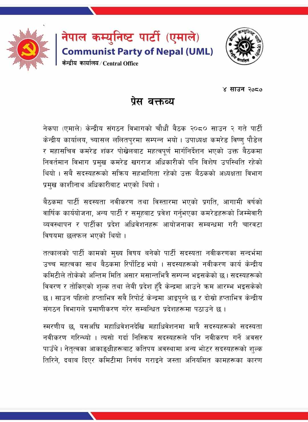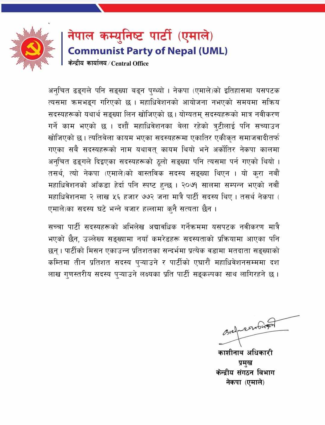 “नेकपा एमालेको सदस्य घटे भन्ने बजार हल्लामा कुनै सत्यता छैन”, उनले जारी गरेको विज्ञप्तिमा भनिएको छ, “सच्चा पार्टी सदस्यको अभिलेख अद्यावधिक गर्नेक्रममा यसपटक नवीकरण मात्रै भएको छैन, उल्लेख्य सङ्ख्यामा नयाँ कमरेडहरू सदस्यताको प्रक्रियामा आएका पनि छन् ।”
