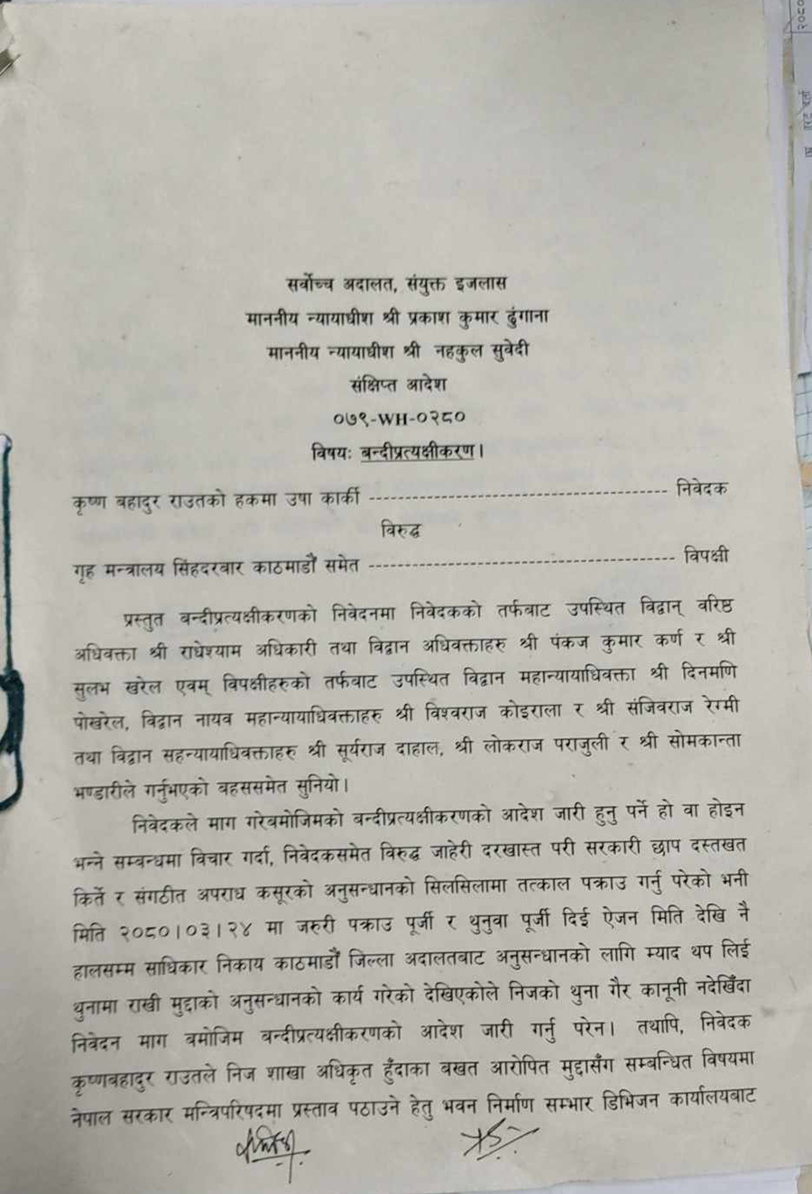 सर्वोच्चका न्यायाधीशद्वय प्रकाशकुमार ढुंगाना र नहकुल सुवेदीको संयुक्त इजलासले राउतलाई थुनामै राखेर अनुसन्धान गर्नुपर्ने आधार, कारण र औचित्य नदेखिएको बताएको छ ।