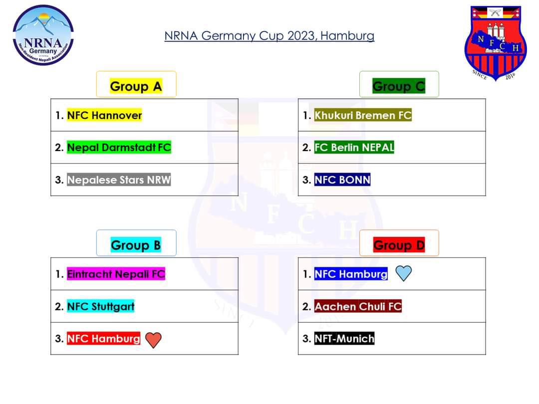 त्यसैगरी समुह ‘सी’ मा खुकुरी ब्रेमेन एफसी, एफसी बर्लीन नेपाल र एनएफसी बोन छन भने समुह ‘डी’ मा एनएफसी ह्यामवर्ग नीलो, आखेन चुली एफसी र एनएफटी म्युनिख रहेका छन् ।