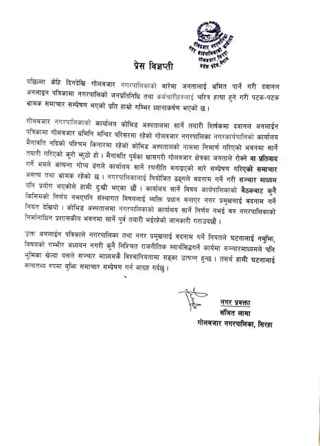 सिरहा।  सिरहाको गोलबजार नगरपालिकाले आफ्नो कार्यालय सार्न लागेको भनेर गरिएको दुष्प्रचारप्रति आपत्ति जनाएको छ।