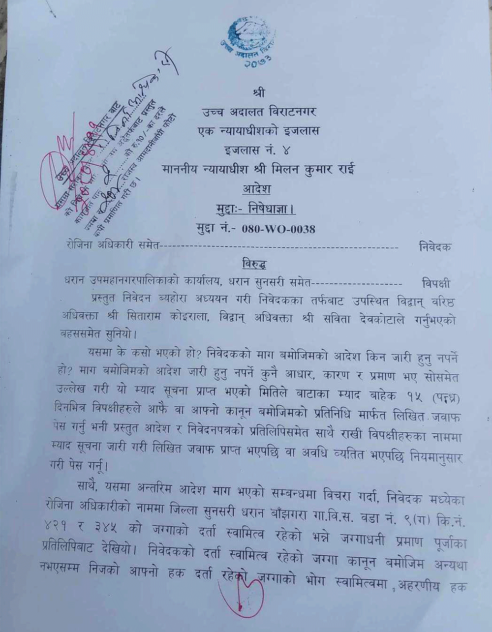 धरान–४ की रोजिना अधिकारीले दायर गरेको रिटमा न्यायाधीश मिलनकुमार राईको इजलासले मुद्दाको अन्तिम टुंगो नलागेसम्म व्यक्तिको नाममा रहेको जग्गामा अनधिकृत रूपमा प्रवेश गर्ने, विरुवा रोप्नेजस्ता काम नगर्न आदेश दिएको हो।
