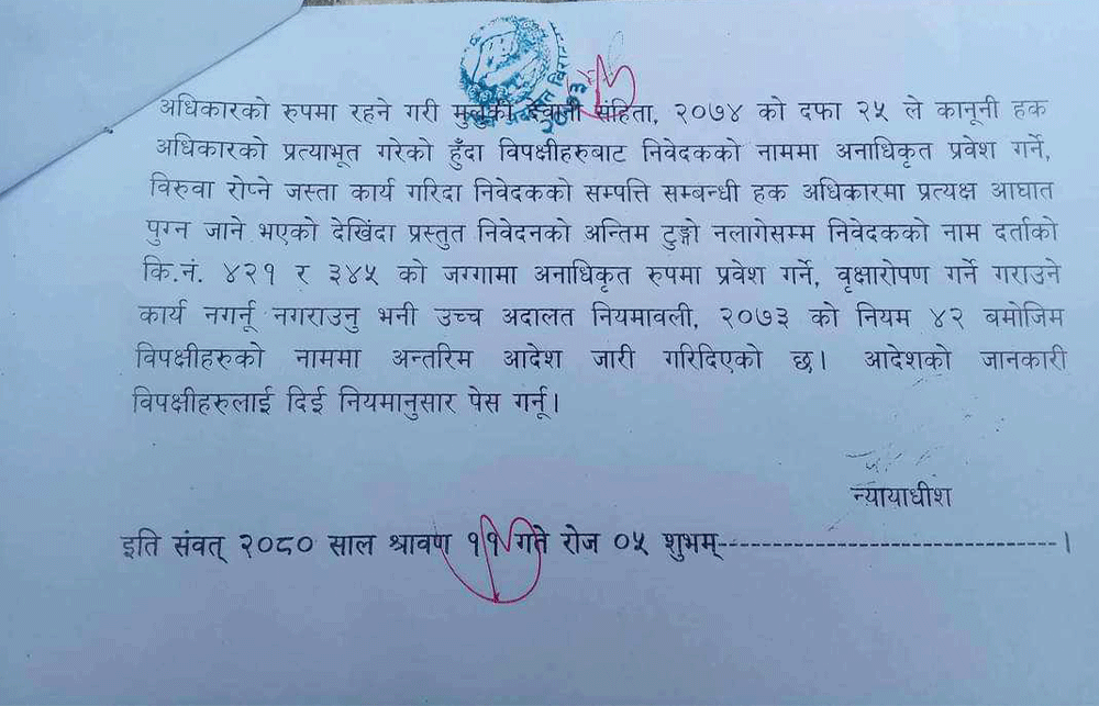 ‘प्रस्तुत निवेदनको अन्तिम टुङ्गो नलागेसम्म निवेदकको नाम दर्ताको कि।नं। ४२१ र ३४५ को जग्गामा अनाधिकृत रुपमा प्रवेश गर्ने, वृक्षारोपण गर्ने गराउने कार्य नगर्नू नगराउनु भनी उच्च अदालत नियमावली, २०७३ को नियम ४२ बमोजिम विपक्षीहरुको नाममा अन्तरिम आदेश जारी गरिदिएको छ । आदेशको जानकारी विपक्षीहरुलाई दिई नियमानुसार पेस गर्नू,’ आदेशमा भनिएको छ ।