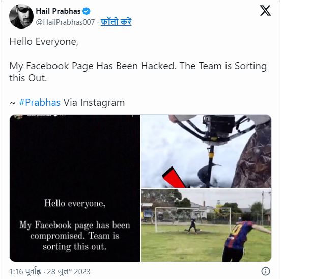 यसैबीच प्रभास सामाजिक सञ्जालमा खासै सक्रिय छैनन्। उनले आफ्नो फेसबुक र इन्स्टाग्राम अकाउन्ट मात्र आफ्ना आगामी फिल्महरूको बारेमा अपडेटहरू साझा गर्न प्रयोग गर्छन्। उनीहरु आफ्नो व्यक्तिगत जीवनको कुनै पनि अपडेट सामाजिक सञ्जालमा शेयर गर्दैनन्। यी सबैको बीचमा प्रभासको फेसबुक पेज ह्याक भएको ठूलो खबर आइरहेको छ। यो जानकारी अभिनेता स्वयंले दिएका छन्।