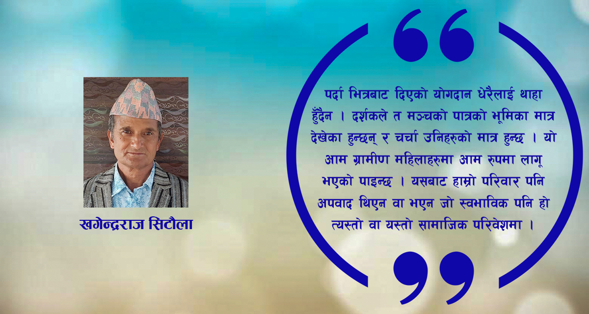 पर्दा भित्रबाट दिएको योगदान धेरैलाई थाहा हुँदैन। दर्शकले त मञ्चको पात्रको भूमिका मात्र देखेका हुन्छन् र चर्चा उनिहरुको मात्र हुन्छ। यो आम ग्रामीण महिलाहरुमा आम रुपमा लागू भएको पाइन्छ।