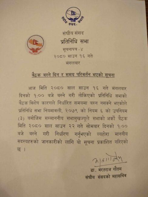मंगलबार दिउँसो १ बजेका लागि बोलाइएको बैठक सभामुख देवराज घिमिरेले सूचना टाँस गरी आगामी साउन २२ गतेसम्मका लागि स्थगित भएको जानकारी गराएका हुन्।