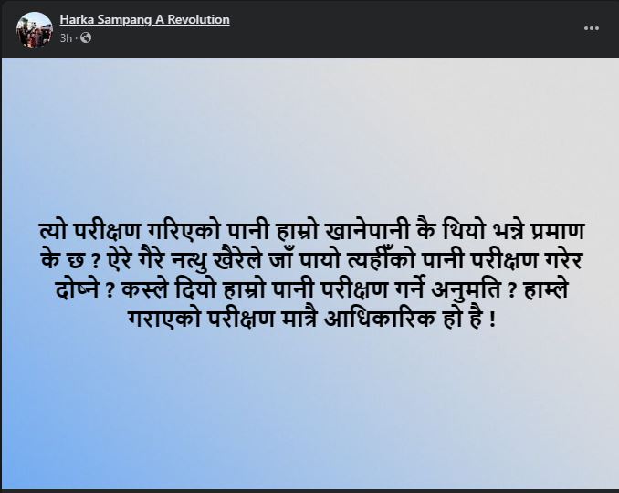 विभिन्न ७ ठाउँबाट संकलन गरिएको पिउने पानीको नमुना नेपाल सरकार खानेपानी मन्त्रालय अन्तर्गतको इटहरीस्थित खानेपानी गुणस्तर परीक्षण प्रयोगशालामा परीक्षण कोलिफर्म पुष्टि भएको हो । पिउने पानीमा कोलिफर्म मिसिएको पुष्टि भएपछि रास्वपाले बिहीबार मेयर हर्क साम्पाङलाई रिपोर्टसहित ध्यानाकर्षण पत्र बुझाएको छ। तर मेयर साम्पाङले भने उक्त कुरा नकार्दै राजनीतिकरण गरिएको आरोप लगाएका छन् ।