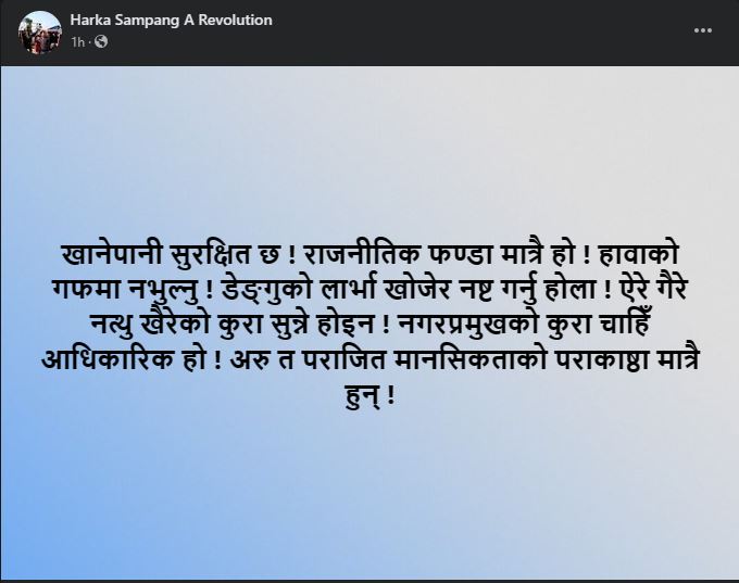 उनले खानेपानीमा कोलिफर्म भेटिएको कुरालाई हावा भन्दै राजनीतिक फण्डा मात्रै भएको बताएका छन् । यस्तै मेयर साम्पाङले परीक्षण गरिएको पानी धरानकै भन्ने प्रमाण के छ ? भनेर प्रश्न पनि गरेका छन् । उनले लेखेका छन्, ‘त्यो परीक्षण गरिएको पानी हाम्रो खानेपानी कै थियो भन्ने प्रमाण के छ ? ऐरे गैरे नत्थु खैरेले जाँ पायो त्यहीँको पानी परीक्षण गरेर दोष्ने ? कस्ले दियो हाम्रो पानी परीक्षण गर्ने अनुमति ? हाम्ले गराएको परीक्षण मात्रै आधिकारिक हो है !’