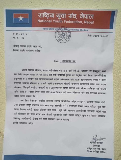 काठमाडाैं। एमाले निकट जनवर्गीय संगठन राष्ट्रिय युवा संघ नेपाल जिल्ला कमिटी धादिङले कुनै पनि बहानामा अपराधीलाई जोगाउने कार्य गरेमा प्रतिवाद गर्ने चेतावनी दिएको छ।
