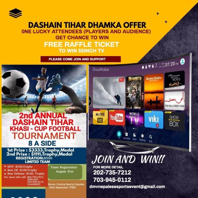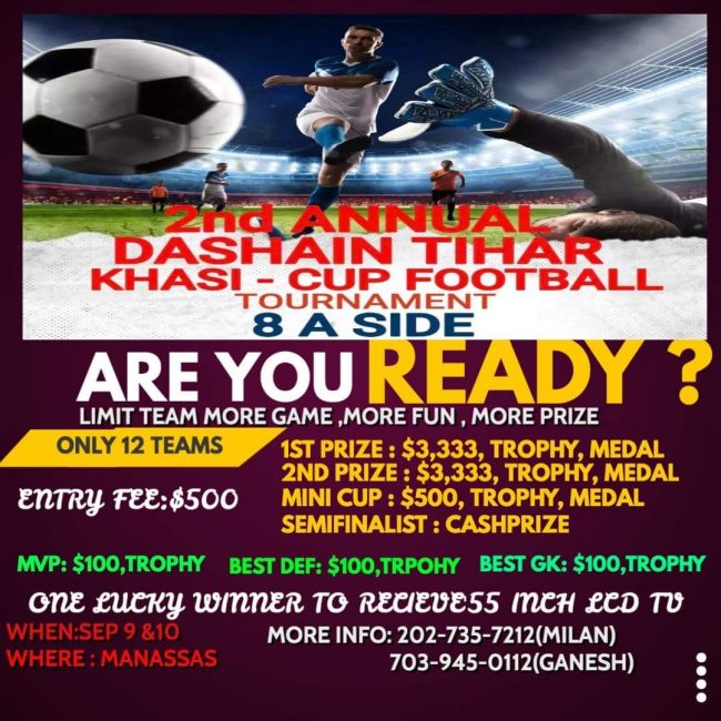 भर्जिनिया। अमेरिकाको भर्जिनियामा दशैं तिहार खसी कप फुटबल प्रतियोगिता आयोजना गरिने भएको छ। मिलन गोर्खाली र गणेश पाण्डेको सक्रियतामा सेप्टेम्बर ९-१० देखि दोस्रो वार्षितक डीभीएम दशैं तिहार खसी कप फुटबल प्रतियोगिताको आयोजना गर्न लागिएको हो।