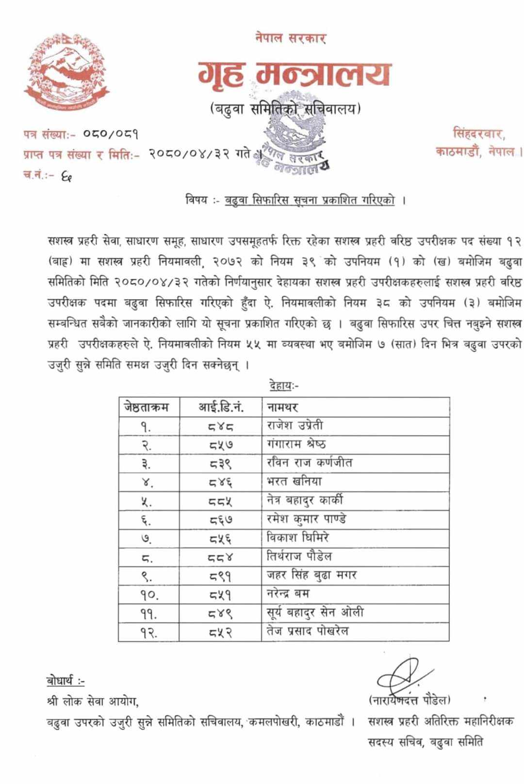 सशस्त्र प्रहरीका १२ जना उपरीक्षकलाई वरिष्ठ उपरीक्षकमा बढुवा गर्न सिफारिस (सूचीसहित)