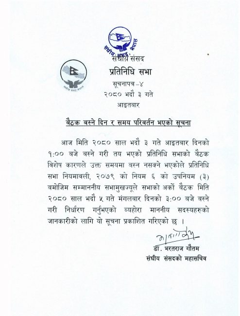 आइतबार बसेको सर्वदलीय बैठकमा पनि सहमति नजुटेपछि आइतबार दिउँसो १ बजेका लागि बोलाइएको प्रतिनिधिसभा बैठक अपरान्ह करिब ३ बजेतिर सूचना निकालेर मंगलबार अपरान्ह ३ बजे बस्नेगरी स्थगित गरिएको छ ।