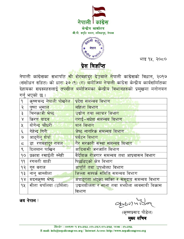 सभापति देउवाद्वारा कांग्रेसका १५ विभागमा प्रमुख मनोनित