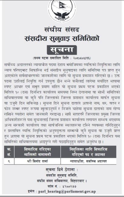 काठमाडौं। संसदीय सुनुवाइ समितिले सर्वोच्चको न्यायाधीश सिफारिस भएका विनोद शर्माविरुद्ध उजुरी आह्वान गरेको छ ।